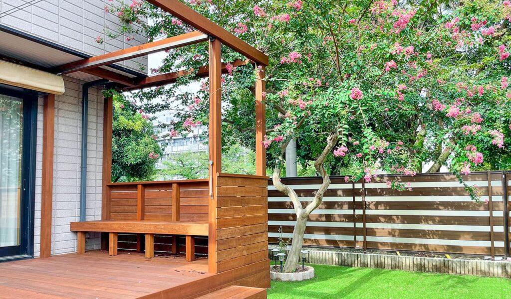 お庭は、ウッドデッキをメインに、適度に緑を残し、すっきりとした空間を創造することを目指しました。強い日差しを遮るシェード付きのフラットなウリン材デッキは、秋になると頭上でサルスベリが美しい花を咲かせます。デッキに備え付けたベンチで、お花見を楽しむことができる空間が広がりました。また、フェンスで囲われた人工芝スペースには、シンボルツリーのハナミズキを植え、春の訪れとともにピンク色の花を楽しむことができます。
