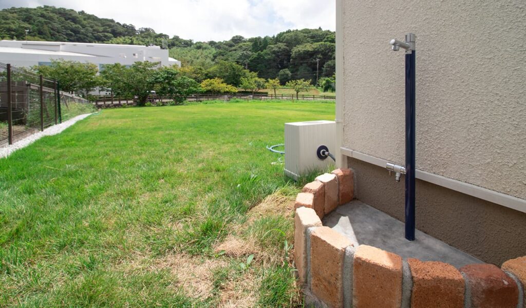 お庭には、可愛らしい造作の水受けと立水栓を新設。お庭をぐるっと囲うフェンスも設けました。その広大なお庭には、お客様ご夫婦が少しずつ芝生を張り、素敵な景観を維持されています。