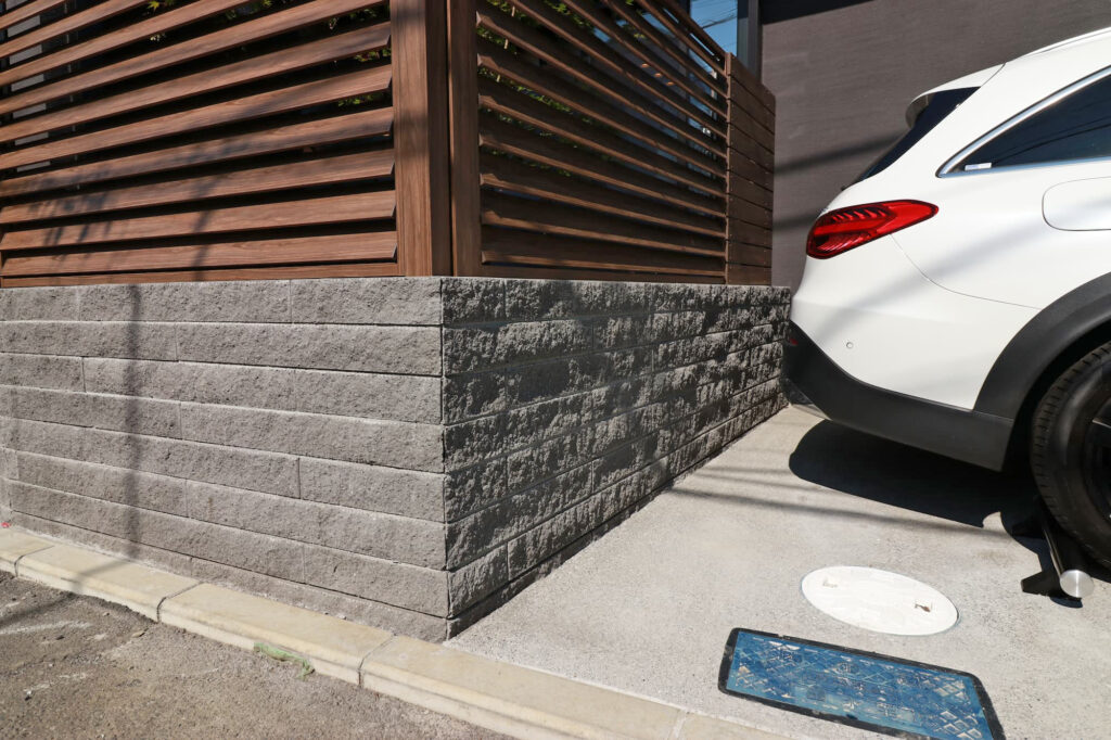 シンプルな作りであるからこそ、使用する素材の選定にこだわり、建物を含めた全体の調和を目指しました。車庫まわりは、石の割肌のような重厚感あるブロックを使用。横長の材を使うことで、平屋の雰囲気に合う安定感を表現しました。そして、アルミ製のモダンな車止めが足元からオシャレ感を演出。良いアクセントとなっています。