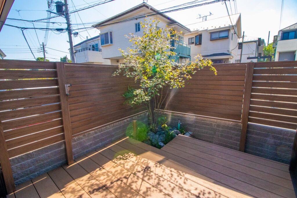 お庭には、開閉式のルーバーフェンスを設置しています。閉じた状態では緑を楽しめる落ち着いたアウトドアリビングになり、ルーバーを開けると、風通しの良い開放的な空間に早変わり。天然木の質感を思わせる人工木デッキへは、リビングからほぼフラットに出ることが可能です。閑静な住宅街ということもあり、 ウッドデッキのお庭で寛いでいただけるかと思います。