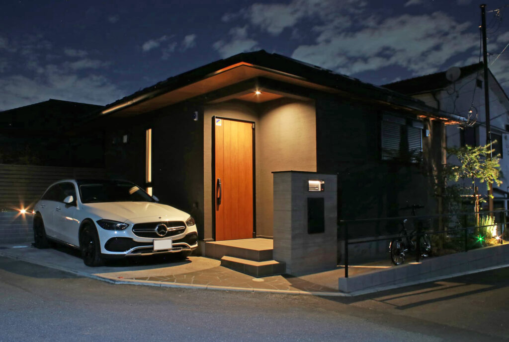 夜になると、お庭のポールライトや各所に配置した照明が、目立ちすぎず外観をほどよく照らし、家族の帰宅を迎えます。