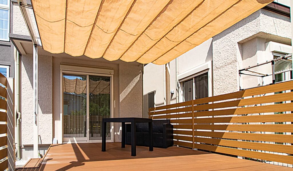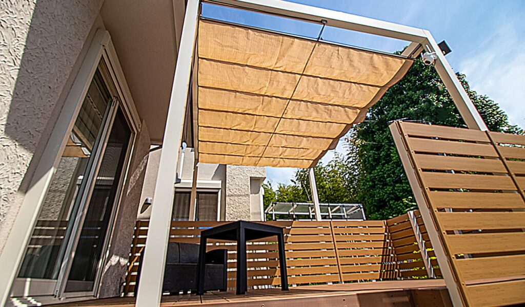 デッキの建物側にはパーゴラを設置し、日よけのシェードを取付けました。優しい日陰が広がり、暑い夏でも快適に過ごせるようになりました。シェードは開閉できるため、日差しを取り込みたいとき、開放的な空間にしたいとき、そのシーンによって、さまざまな使い方が可能です。