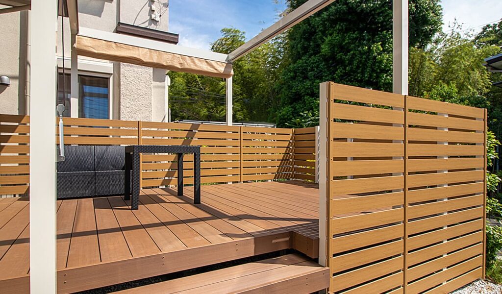 ご要望に合わせて、人工木デッキと樹脂の目隠しフェンスをご提案いたしました。目標とする雰囲気に合わせて商品や色味を選定しました。10帖ほどの広さがあるため、お部屋が一つ増えたような感覚で色々な使い方が楽しめるかと思います。