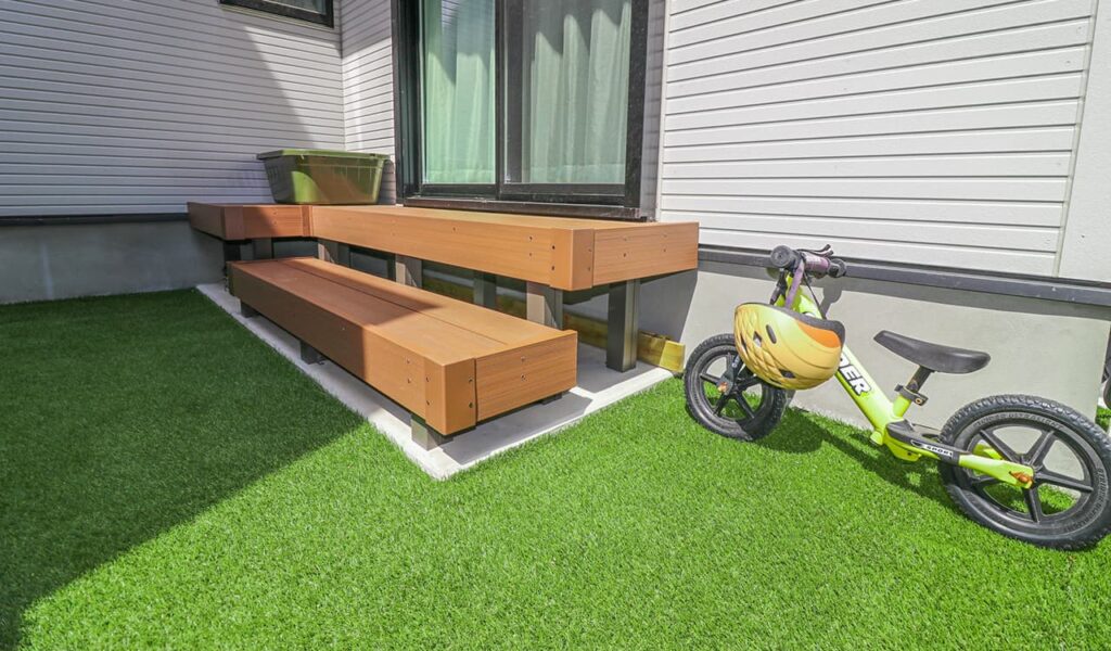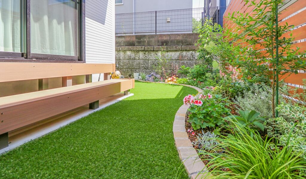 お庭は、花壇・人工芝・ウッドデッキの3つの要素をバランスよく配置し、機能性とデザインを両立させています。ピンコロ石で縁取った花壇を設け、お客様が自由に植栽を楽しめるスペースを造りました。ご購入されていたさまざまな植物たちが、美しい曲線を描く花壇にお客様の手で植えられ、生き生きと育っています。高さがあり出入りしづらかった掃き出し窓の前には、人工木デッキを作りました。ステップを設置することで、庭から家へのアクセス性を向上させ、腰掛けとしても活用できるようにしました。