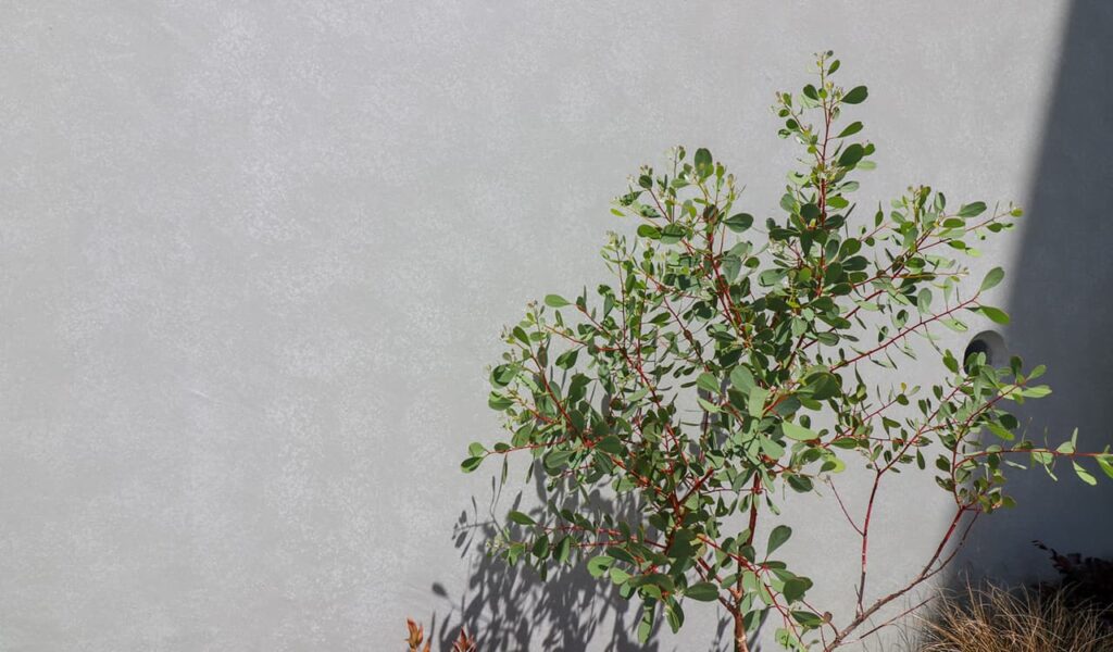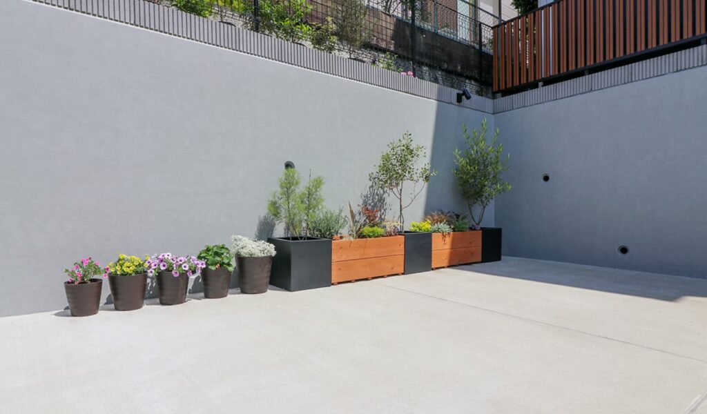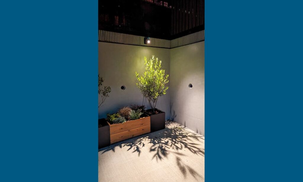 ファサードにおいては、道路からの視線を遮る目隠しフェンスを設置し、プライバシーを守ると共に、建物の美しさを更に引き立てました。また、塗装によりRC擁壁や階段まわりの美観を向上させ、高級感を演出したことで、お客様の生活空間が一層洗練された雰囲気となりました。夜間の駐車場の視認性を高めるため、スポットライトを設置。植栽の影が地面に落ち、良い雰囲気になっています。