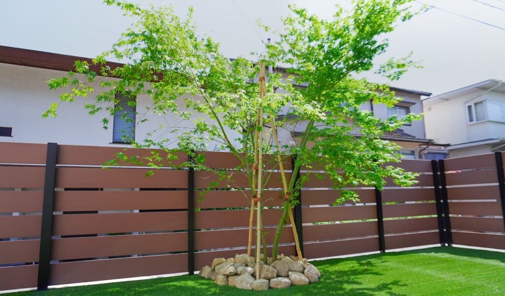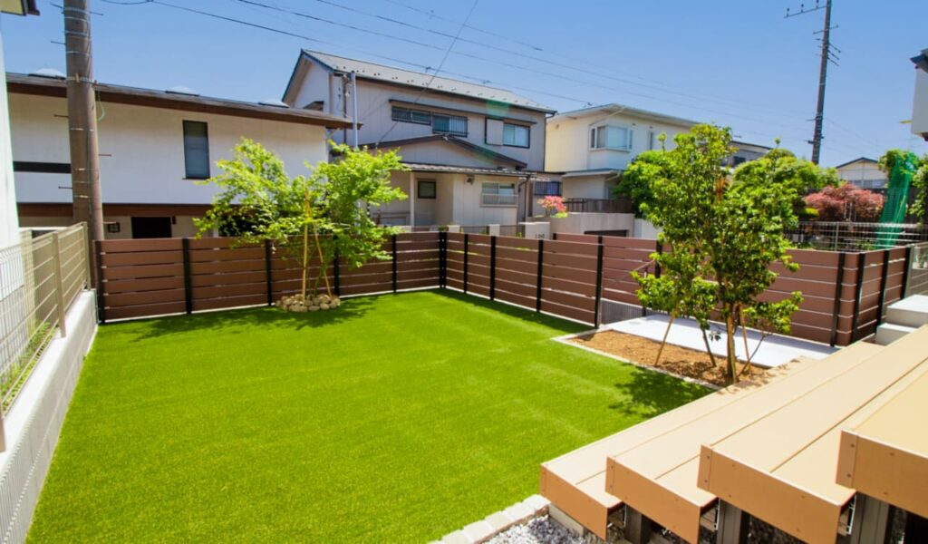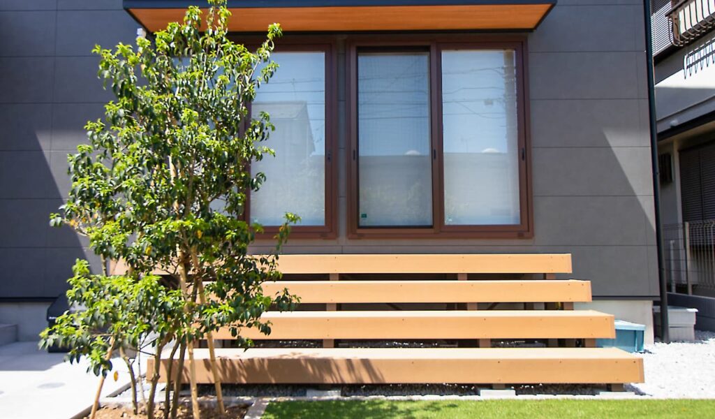 広々としたお庭空間は全面人工芝敷きにし、お子様が存分に遊べる空間を提供しました。高さのある掃き出し窓の前にデッキ階段を設置し、お庭へのアクセスを容易にしました。これにより、お客様は気軽にお庭スペースを活用し、憩いの時間を過ごすことができるようになりました。美しく広がるモミジを植え、お庭に彩りを加えるとともに、季節の移ろいを感じられる空間を創出しました。モミジは道路からも良く見えるので、シンボルツリーの役目もはたしています。