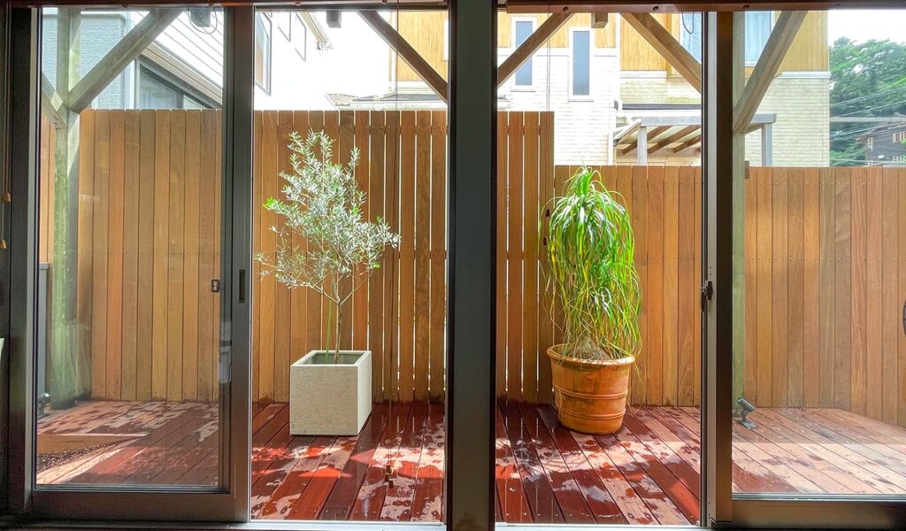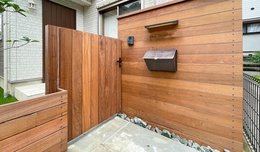 お住まいの風土に合わせ、イペとウリンのハードウッドを主体に進行しました。門まわりはイペ材で統一し、既存のポストと表札を活かすことで、自然と一体化した落ち着いた雰囲気を醸し出しました。また、プライバシーを守るため、大きな掃き出し窓の前には、高さのある目隠しフェンスを設置。これによりお客様は、カーテンを開けても外からの視線を気にせずにリラックスできる空間を手に入れました。
