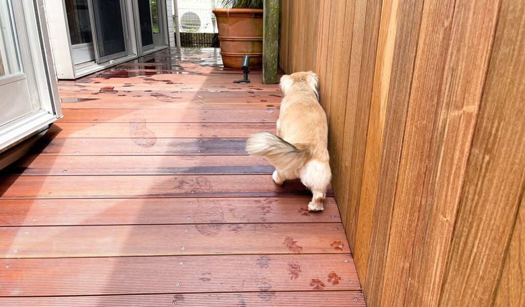 今回、我々にご相談いただいたのは、天然木を使ったウッドデッキと目隠しフェンスの設置でした。そこで私たちは、山間に佇む住宅に合うような、天然木のイペ、ウリンを使った外構をデザインしました。愛犬のミニチュアダックスフンドの遊び場となるようなお庭も兼ねたプランニングを進めていきました。