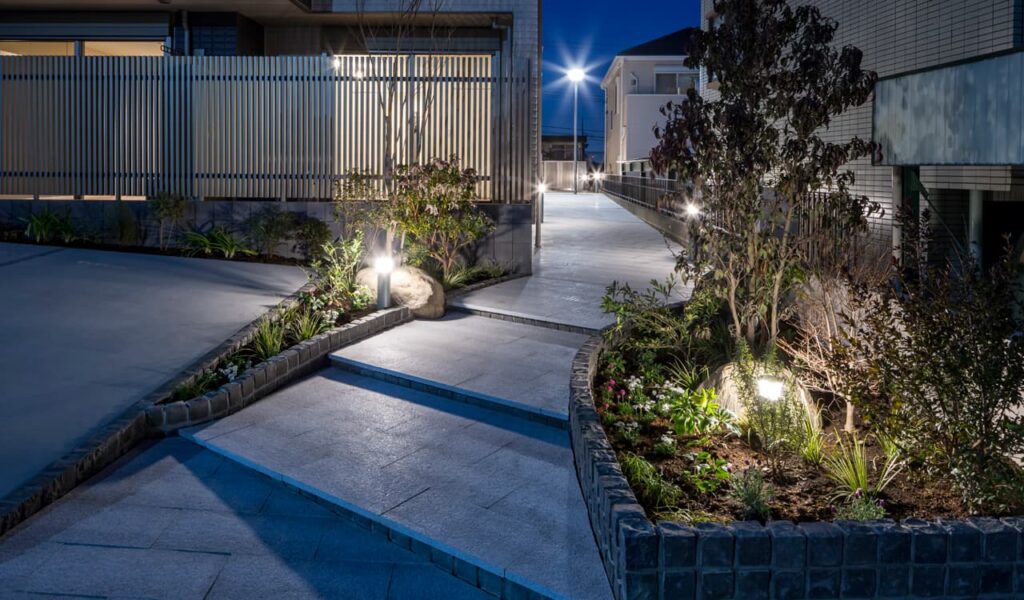 お客様の想いを具現化するため、私たちはアパートのアプローチを中心に外構のトータルデザインに取り組みました。アプローチには白い石板を敷き詰め、階段の両側には黒いピンコロ石で花壇を作りました。夜は植栽がライトアップされ、帰宅する住人を温かく迎えてくれます。石板は、石材店に大きさと厚みを指定して作ってもらった特注品。雨水がエントランスやアプローチに溜まってしまわないよう、排水計画も入念に行いました。