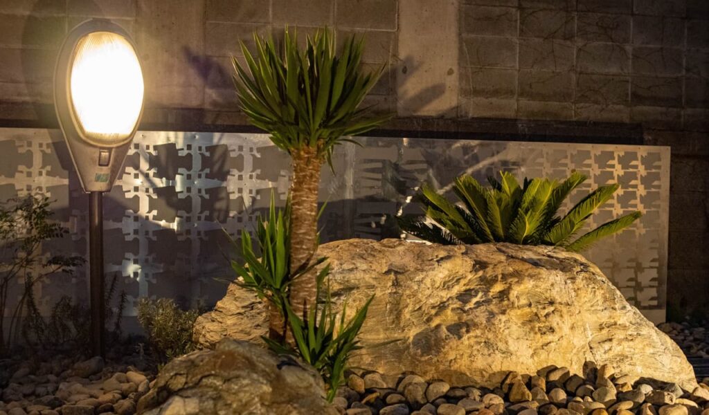 そして注目すべきは、お客様自身がデザインされた中央のロックガーデン。ここでは、不要になった高速道路用の照明とステンレス板金の廃材をリユースしています。お客様と一緒に買い付けに行き、施工時は配置細かい調整もお客様と行いました。エントランスから見せる中庭はとても素敵で、自然素材のブロックと人工物のリユース品が融合し、独特の魅力と深みを放つ空間が生まれました。