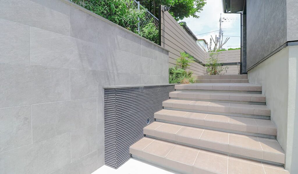 アプローチ部分は、壁面に貼ったグレーの自然石調タイルを主役に、数種類のタイルを使用しています。土留めはアクセントになるよう、水平ラインのボーダータイルで仕上げました。アプローチの要所には、ジューンベリーや低木・下草の寄せ植えの植栽帯を配置しています。夜には、これらのタイルや植栽をライトアップ。昼夜問わず美しい風景を演出することができました。