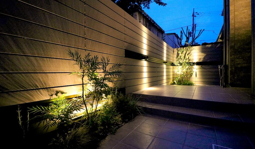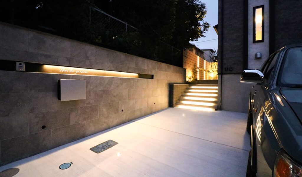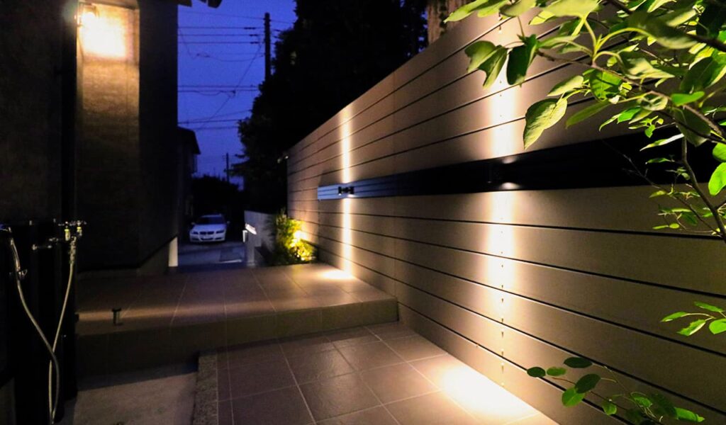 お客様は、スタイリッシュでモダンな感じのアプローチと、広めのドッグランにしたいという具体的なご要望をお持ちでした。そのイメージを形にするため、我々は昼はスタイリッシュな雰囲気、夜は幻想的な灯りに包まれる表情豊かなエクステリアをプランニングしました。特に、お客様が決めかねていたライティングについては、スタッフからアドバイスをさせていただきながら決めていきました。