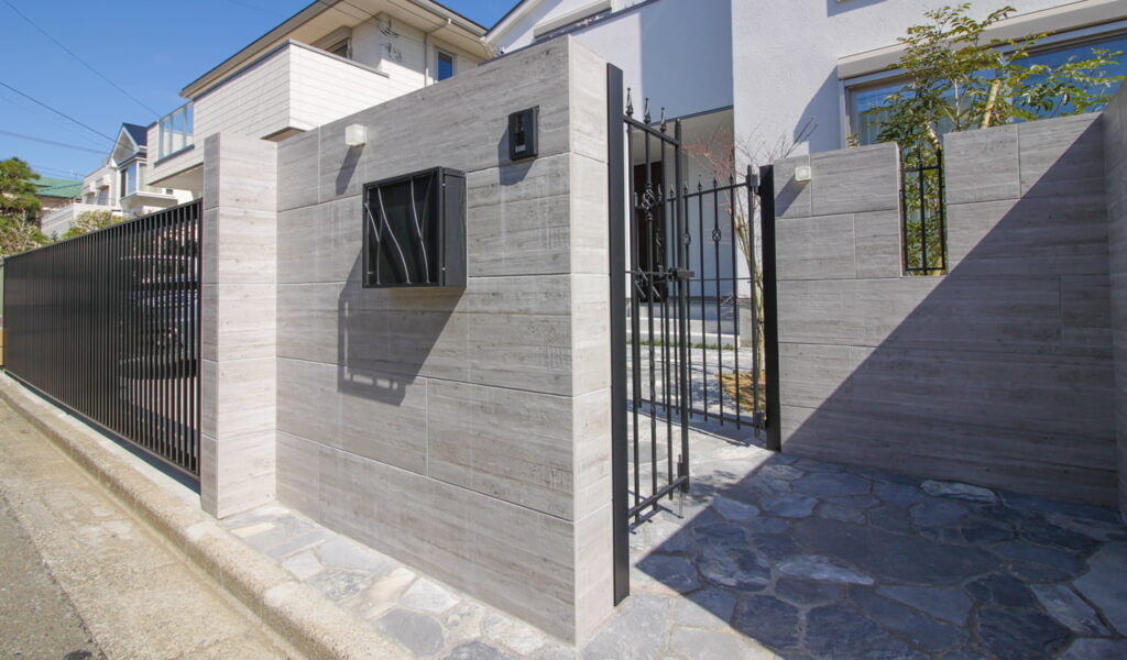 門回りのブロック塀には、化粧材として杉板目コンクリート調タイルを全面に貼り、無機質でシャープな雰囲気を創出。門袖にはポストと表札の黒を配し、コントラストを利かせました。邸宅の雰囲気に合わせてアイアン調の門扉を選択。同素材のアイアンで、塀に入れたスリットにアクセントを加えています。アプローチは、同系統の濃い色と薄い色をランダムにした石貼りで仕上げています。