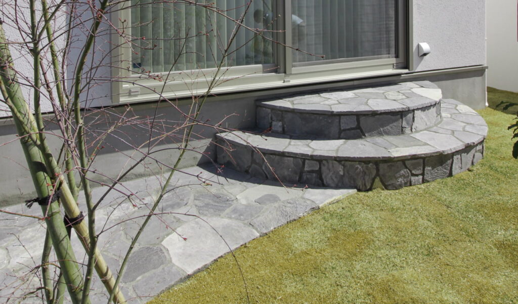 最後に、お庭のデザイン。芝庭と植栽スペースを設け、自然との一体感を演出しました。アプローチと同じ乱形石を使ったテラスは、掃出し窓からお庭に出るために使い勝手が良いステップとして機能します。スタッフとの繰り返しのやり取りの中で、お客様の理想を形にすることができました。