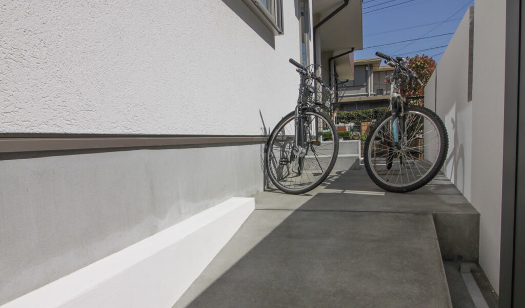車2台分のカースペースの前には出庫が楽なオーバーハングの電動カーゲートを設置。勝手口側には駐輪スペースを配し、出し入れのしやすいスライド門扉を設置。毎日の出入りをスムーズにするために、何度も動きをシミュレーションし、最善のプランを提案しました。更に、自転車を運びやすいように緩やかなスロープを設置。外からは見えない高さに設定し、プライバシーも守りました。