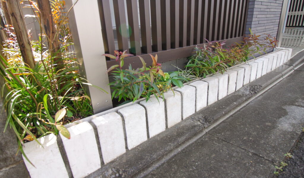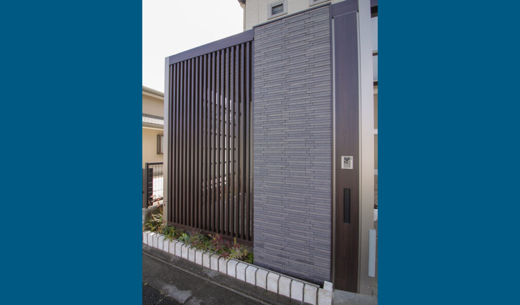 ファンクション柱にはインターフォンやポストを設置。同じく高級感のある木目調のGフレームとマッチし、統一感を出しています。壁面は、濃いグレー系のタイル仕様。足元には白いピンコロ花壇に植栽が入り、シャープな印象のプラスGとのコントラストが見事です。