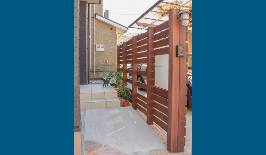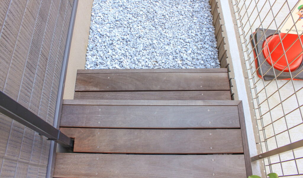 特にお客様が気に入っていただいたのが、ウリンフェンスに真鍮の蛇口をつけた立水栓。シンプルでおしゃれなデザインが、お客様のセンスを物語っています。さらに、玄関前のタイルとも相性が良いウリンのステップは、お客様のお家へと続く道を美しく演出しております。