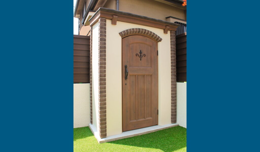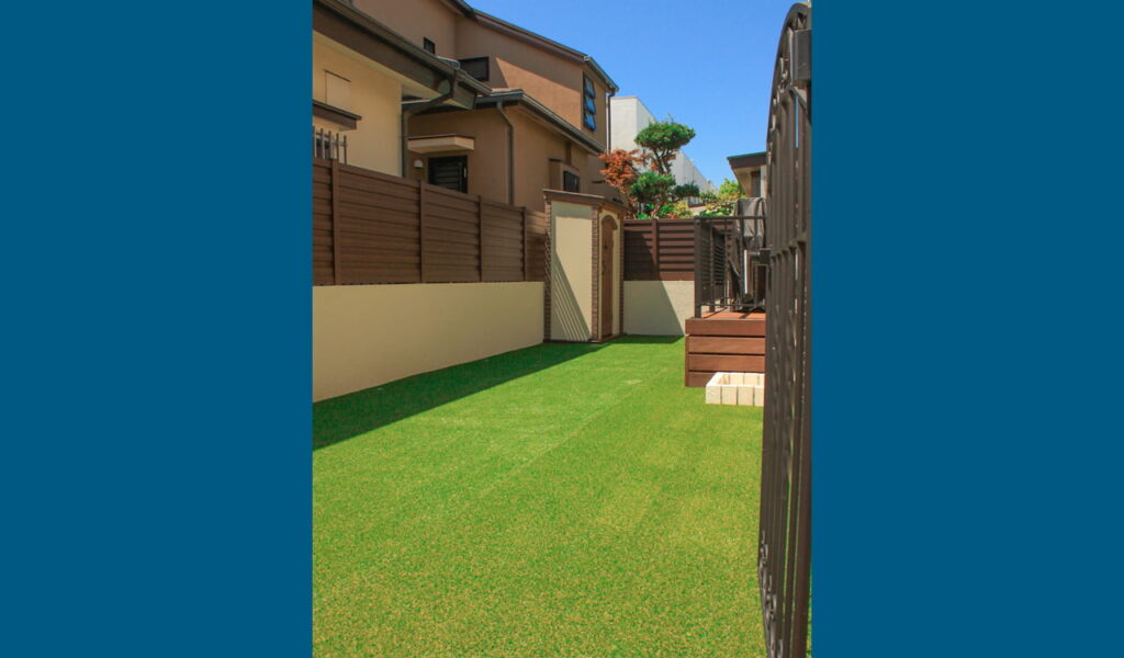 人工芝とウッドデッキのお庭は、お客様が休日にリラックスできる場所として、また、ペットと遊ぶスペースとしても機能します。木目調フェンスや物置「カンナキュート」、立水栓もヨーロッパ調の白レンガで統一し、エレガントな雰囲気を一層深めています。ウッドデッキにはシックなアイアン調の手摺りを設置し、華やかさをプラス。