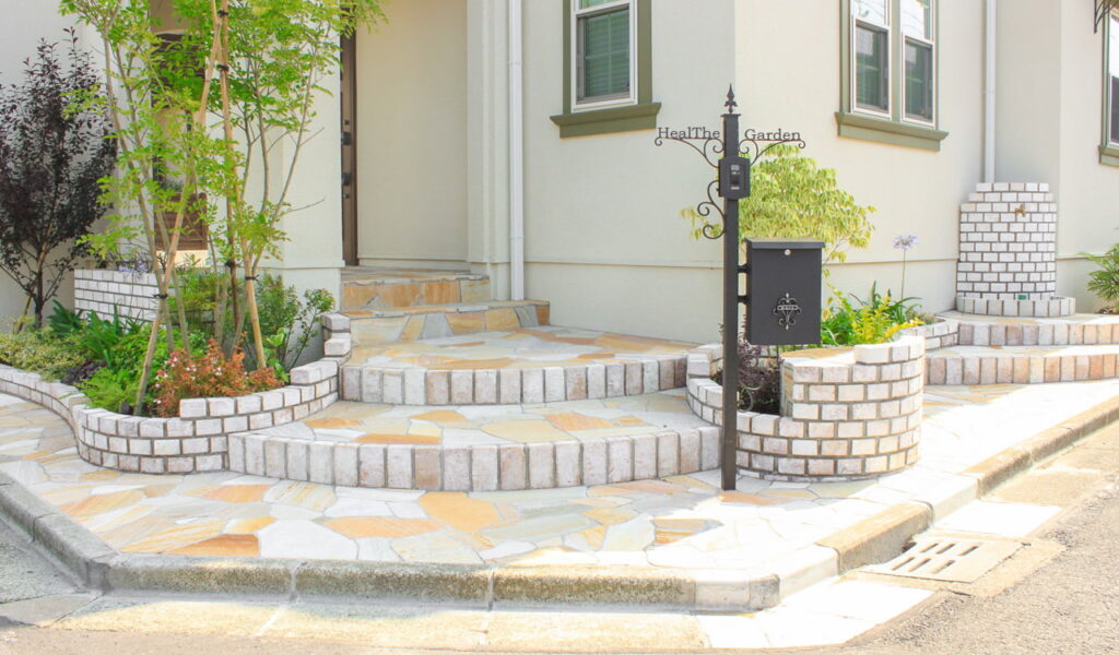 お客様が望まれていたのは、エレガントでありながら、自然のぬくもりを感じられる外構。そこで我々は、様々な曲線を用いて柔らかな雰囲気を醸し出すデザインを提案しました。ファサードには、イエローの自然石と白いレンガを使い、建物と調和した色合いのデザインです。カーポートは、外から目立たない位置に設置し、全体のバランスを崩さないよう配慮しました。