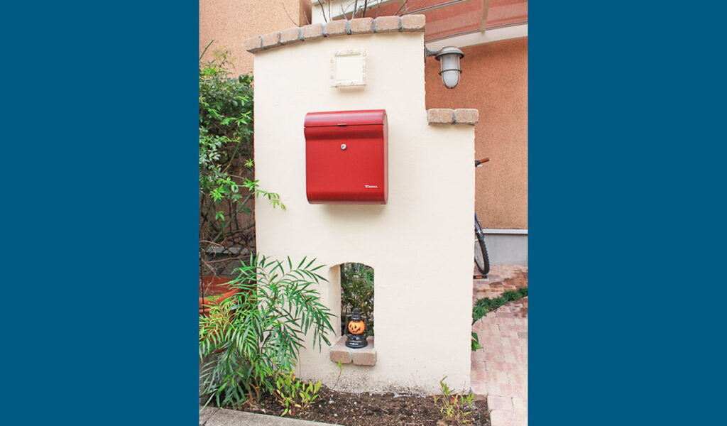 ポイントは、赤のモダンなポストが差し色となるジョリパットの門袖に、アンティークレンガの笠木が加わり、ナチュラルな印象を与えること。サイクルポートにはLIXILのメジャーポートⅡRタイプを採用し、機能性とデザイン性を両立。そして、ガーデニングも楽しめるよう、玄関前のコーナーに花壇を設けました。