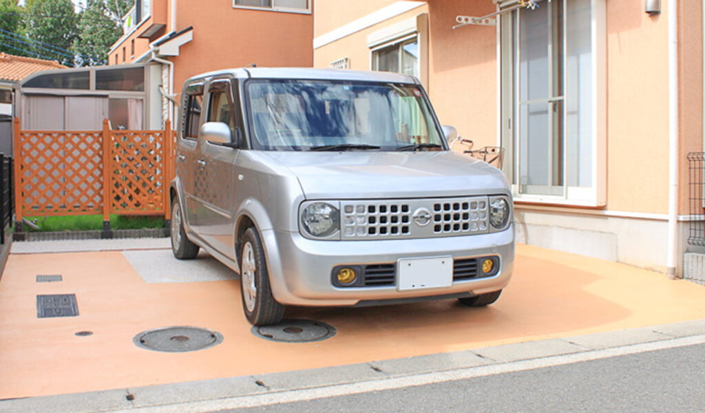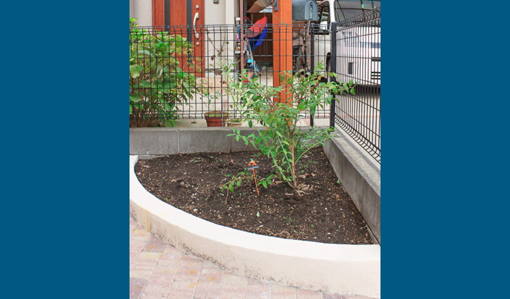 施工前の機能門柱から門袖に変えたことで家と外構の一体感が出せました。手入れの大変な植栽も花壇スペースや鉢植えにすることでメンテナンスが楽になりました。また駐車場スペースは外壁に合わせたオレンジのカラーコンクリートを選びました。