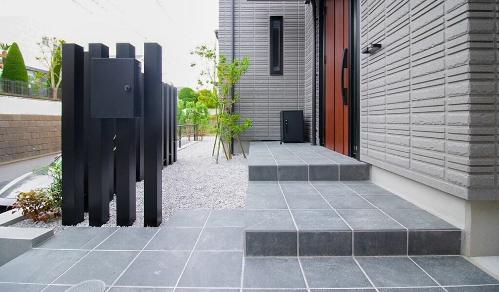 しかし、シンプルなデザインだからこそ、その細部にこだわることが必要となりました。エクステリアのメインとなる階段は、蹴込を深く取ることで、浮いているように見えるフローティングステップを採用。玄関前の目隠しとして設置した漆黒の列柱は、そのままだと黒が強すぎて冷たい印象になってしまうため、植栽を入れて柔らかさと美しいコントラストを演出しました。玄関アプローチのタイルやポストは、グレーの建物外壁に馴染むように選定。ライン状の表札は、視認性とデザイン性を重視しました。