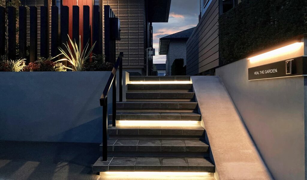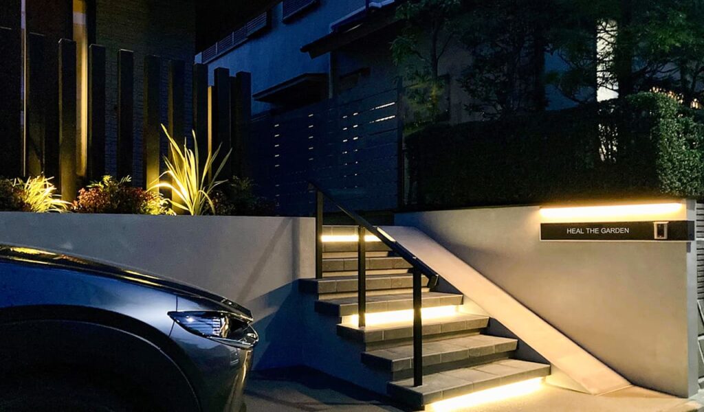 また、夜間の印象も重要です。階段の蹴込部分や植栽など、要所に配置した間接照明により、夜間でも美しく、幻想的な雰囲気を演出しました。我々が心を込めて作り上げたライティングが、お客様の新生活を彩るファサード空間を創り出すのです。住む人にも通る人にも、印象的なファザードを目指してデザインしました。
