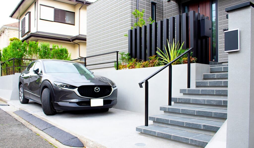 我々がご相談いただいたのは、車1台分の駐車場、玄関に続く階段の設置、そして植栽を取り入れたモダンな印象のエクステリアにしたいというご要望。このご要望を叶えるために、黒を効かせたモノトーンの配色で、シンプルながらも印象的な外構デザインをご提案いたしました。
