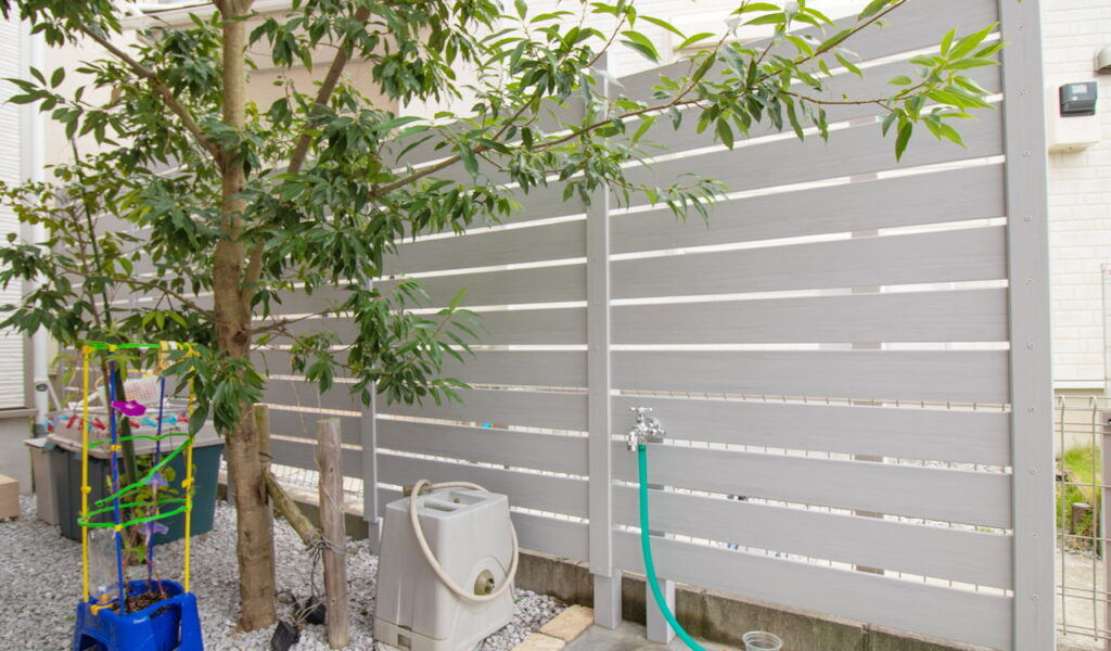 一方、お隣との目隠しのために設置した樹脂製フェンスは、木調クールグレーの色味をセレクト。お洒落に、圧迫感なくお隣との目隠しをしています。