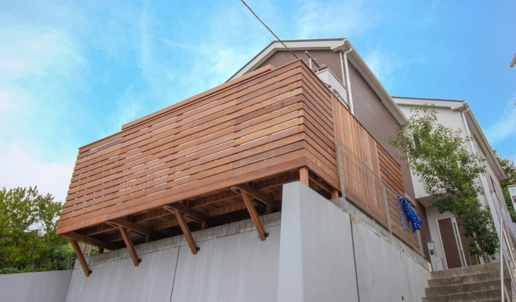 お客様のお悩みは、庭空間をどのように活用するか、そしてお隣との目隠しをどうするかでした。私たちは、これらの要望に対して、ウッドデッキと樹脂製フェンスを提案しました。特にウッドデッキは、ご自宅の地形を活かし、擁壁にオーバーハングする形で既存の庭を少し広げたデッキテラスにする設計をしました。