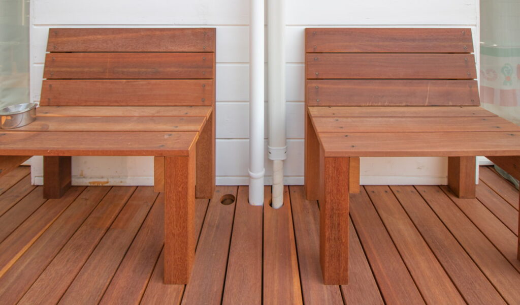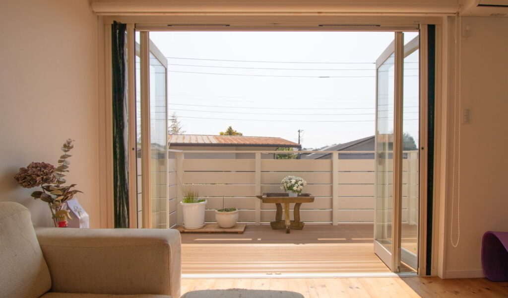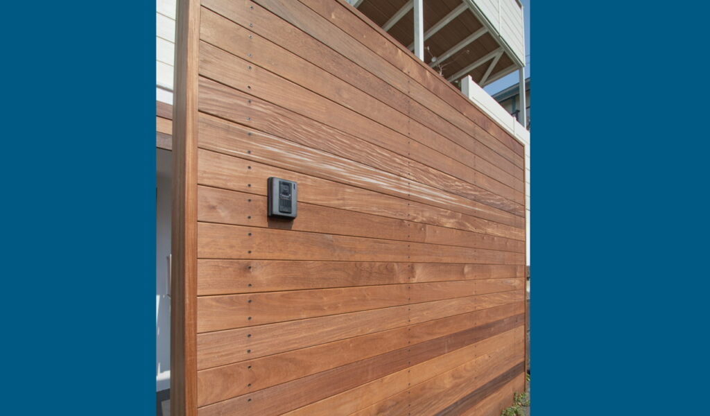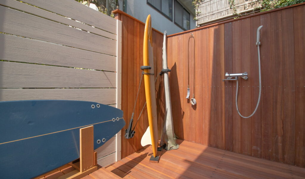 樹脂フェンスの内側には、広々としたウッドデッキがあります。サーフィンから帰った際にシャワーを浴びたりボードを洗ったりできるブースをデッキに設置。これにより、お客様の趣味であるサーフィンと、新たな空間が結びつくこととなりました。