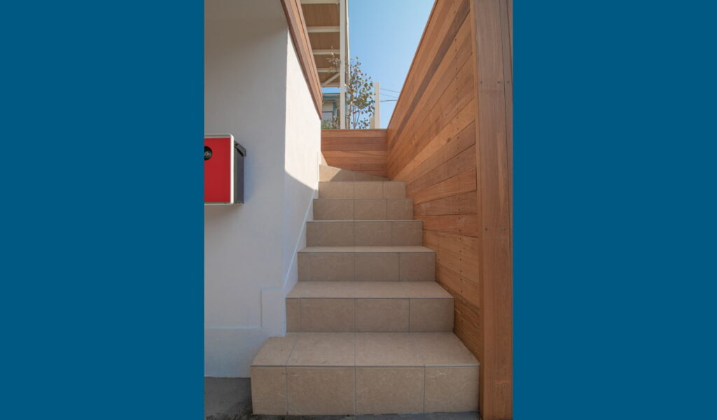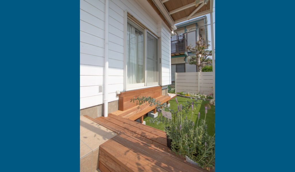 アプローチ階段は、アイボリー系のタイルで装飾。これにより高級感を持たせつつ、ナチュラルな雰囲気も引き立てました。さらに、玄関右手のお庭は人工芝とウリンのベンチにリフォームし、お客様の日々の生活をより豊かにすることを目指しました。