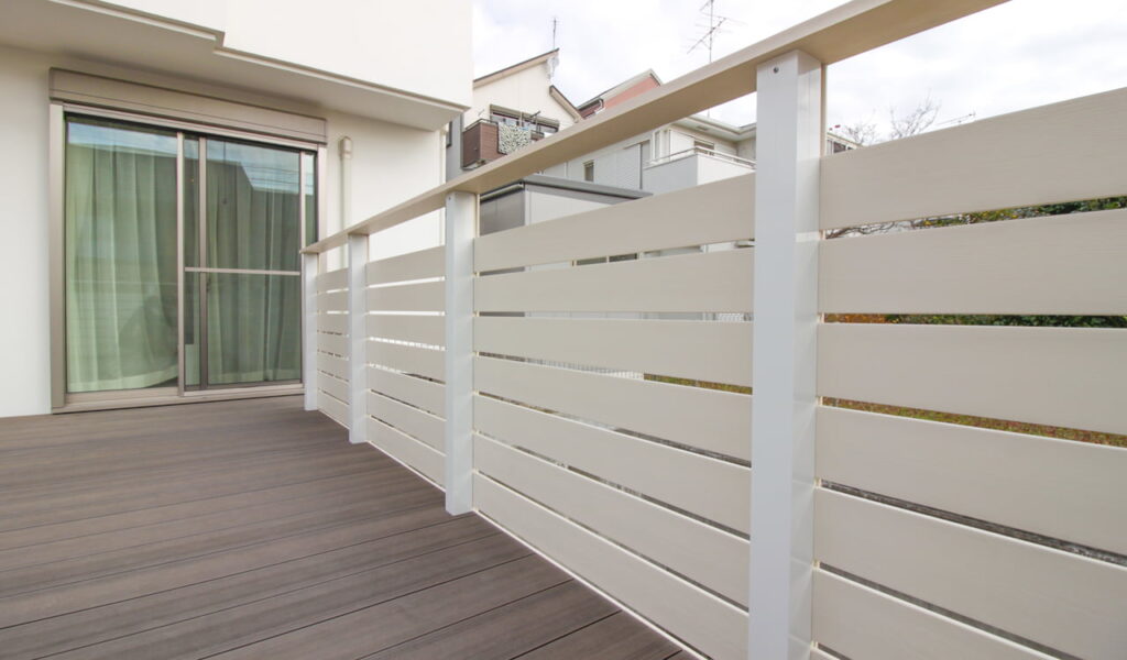白い邸宅と一体感のあるデッキバルコニー。お子様が遊べるスペース物干しやお子様が遊べるスペースとして、日常生活に彩りを添えます。メンテナンスのあまりかからない人工樹脂デッキを使用することで、お客様の手間を軽減させました。そのデッキを囲む白いフェンスは、木目調のアルファウッドフェンスを採用。