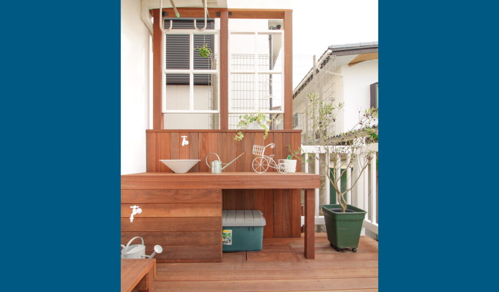 まず、我々は白を基調とした清潔感あふれるデッキテラスの設計を提案しました。景観の良い高台に面した擁壁にせり出す形でオーバーハングしており、デッキスペースが広く使えるようになりました。さらに、蛇口や飾り窓も白で統一し、ナチュラルな印象を強調しました。