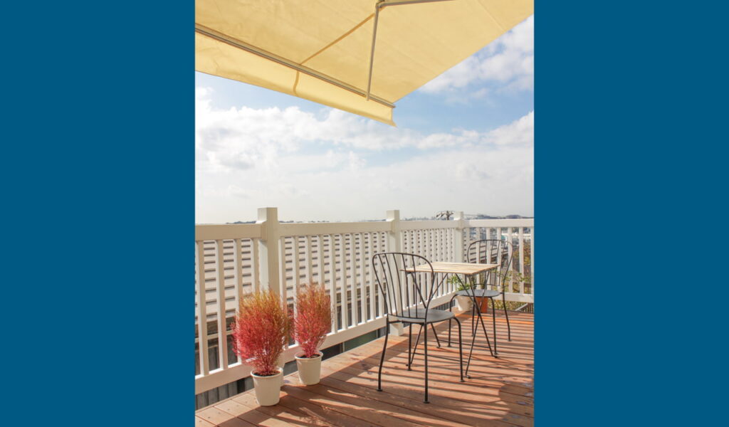 さらにお施主様支給品のオーニングを取付けたことで、高台にある絶景カフェのような雰囲気になりました。お天気の良い日は富士山も見えるそうです。