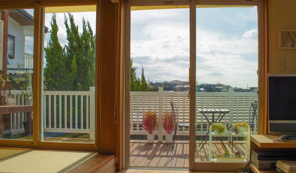 小上がりの和室の掃き出しに高さを合わせた、内部に収納も可能なステップを設置しました。これにより、和室からのアクセスもストレスなく行えます。室内からも、デッキテラスと眺めの良い景色が一望できます。